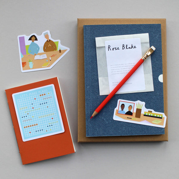 Ahead of the launch of our "Let's Make Plans" collaboration with illustrator Rose Blake, we visited her in her East London studio to talk all things stationery, paper and organisation, as well as what inspires her and how she ended up doing what she does. How did you come to be an illustrator? As a kid I wanted to be opera singer, but to get to that point you just have to be the most amazing singer and I wasn't! And after that I didn't really know what I wanted to do. I was not into drawing as a child. I mean, you don't want to do what your parents do, do you? And they set the bar so high. So I was much more into other stuff, like being outdoors, just playing. My A-level art teacher recommended Kingston, so went there for foundation, and then my tutor there noticed that I like telling stories in my work, I like narrative and communication in my work, so she suggested I try illustration for my degree. Where do you get your inspiration? Everywhere really. I go into a deep research mode, I like to have a full day of research ideally before starting a project. I'll look through archives, go to the library, look online, I will look at other illustrators, artists, designers. Inspiration is everywhere really, it's just about the way that you look at the world, you can pick up on different little things. Even the way people interact in the street — everything is research in a way, you just have to be open to looking at it really. I will write "man with bright pink glasses and cropped neon hair" just as a note in my phone. And then I've got a list of all sorts of things like that that I come back to later and think "ooh I can make a little drawing out of that." So you are quite into stationery? Oh yes, I love stationery so much! I am quite an ordered person. I'm the kind of person that makes a list and writes something that they've already done, just so that I can tick it off! I always have a notebook on the go, and I find it quite hard to change, quite sad to finish one and move onto the next. I can't throw them away, I've got drawers full of them going back fifteen years! In my notebook, that's the place where I can be absolutely free and just write silly ideas, do silly doodles. It's never neat inside the notebook, whereas stuff outside is always quite neat. It's like a little snapshot of all your thoughts and ideas from an acute period of your life. And you keep a paper diary? I've never had an iCal or a Google calendar or anything like that. My brain only works if I write it down on paper, and I need to see exactly what I've got to do today. I just couldn't live without a paper diary, no way! Tell us about your sticker system? I have a little system in my diary that I use every month. So there's a different colour to show when I've done exercise, which days I have to go to work (and a little tick next to it when I've invoiced!). At the back I have a set of stickers which all have a different meaning according to the colour. I'm very into stickers! I've got a collection and I keep them in my desk drawer. What's your earliest memory of paper? My school books that I would go and buy for the new school year. That was always the most exciting part of the school year for me, buying the notebooks and have a brand new start of the year. They have really soft paper, a bit see-through. What are your favourite writing tools? I use a black fineliner pen, a thick pencil (a 4B at the lowest, I hate hard pencils, I really hate H pencils!). I also use Caran D'Ache colouring pencils, a Lamy ink pen (I've got two — one for home and one I have in my bag at all times. I'm always really ashamed if someone asks "have you got a pen" and I've not got one, so I always make sure that I;ve got a pen and a pencil with me. Is there an item of stationery that should exist but doesn't yet? What about a pen that's a pencil at the same time? Or perhaps that does exist? Do you have daily rituals that help you feel organised? Yes, I like to have a list of things to do for the day, which I will write in my diary. And then I've got another list of things that are the more long-term list of things that I've got to do, just life things. I like my desk to be quite tidy. I find it really stressful to start work when the desk is messy from the night before, so I always tidy the desk at the end of the working day, ready for tomorrow. I like to have everything in order before I start. I like to have a lamp, with a cosy warm bulb, even if it's a sunny day. It just sort of helps you focus in on that space. Do you listen to music in your workspace? I listen to a lot of podcasts and NTS radio — I specially like the Flow Show in the morning, and I go back through the archive of those too. It's quite nice and chatty, and introduces me to music I wouldn't necessarily know otherwise. What aspect of your work are you most proud of? I make a lot of picture books and recently what I've really loved is when children really appreciate them. — Discover our "Let's Make Plans" collaboration by Rose Blake for Mark+Fold